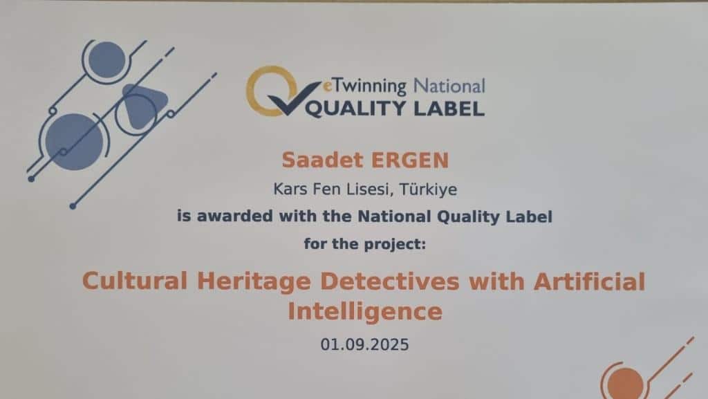 Okulumuz, 2024-2025 eğitim-öğretim yılı boyunca İngilizce öğretmenimiz Saadet ERGEN koordinatörlüğünde, 9. ve 10. sınıflardan oluşan 6 öğrencimiz ile yürütülen “Cultural Detectives with Artificial Intelligence” isimli eTwinning projesiyle ulusal çapta önemli bir başarı elde etti. Ulusal Destek Servisi (UDS) tarafından yapılan ayrıntılı değerlendirme sonucunda projemiz, Ulusal Kalite Etiketi ile ödüllendirilmeye layık görüldü.